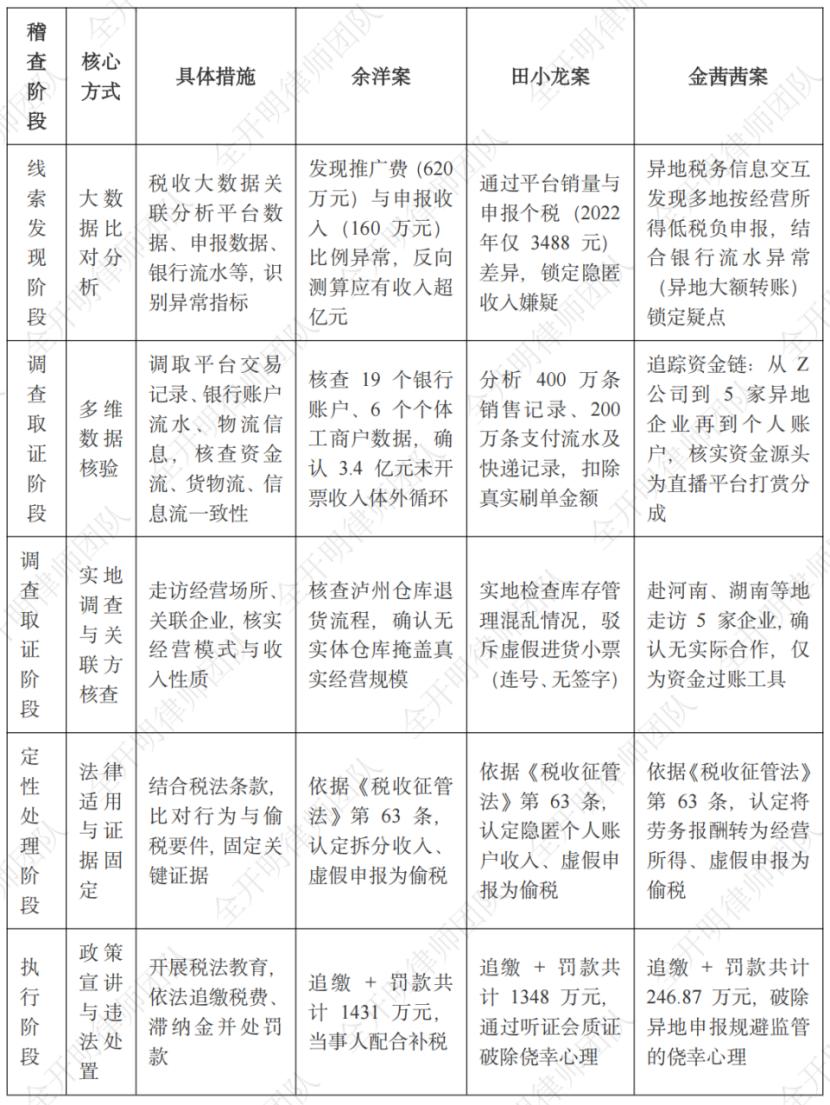 三起案件均以大数据分析为线索起点,但因违法手段不同,稽查逻辑各有侧重:余洋案聚焦“收入分散与体外循环”,田小龙案聚焦“销量与申报的真实性核验”,金茜茜案聚焦“收入性质的合规界定”,共同体现了“数据穿透+证据闭环+法律适用”的税务稽查核心逻辑。